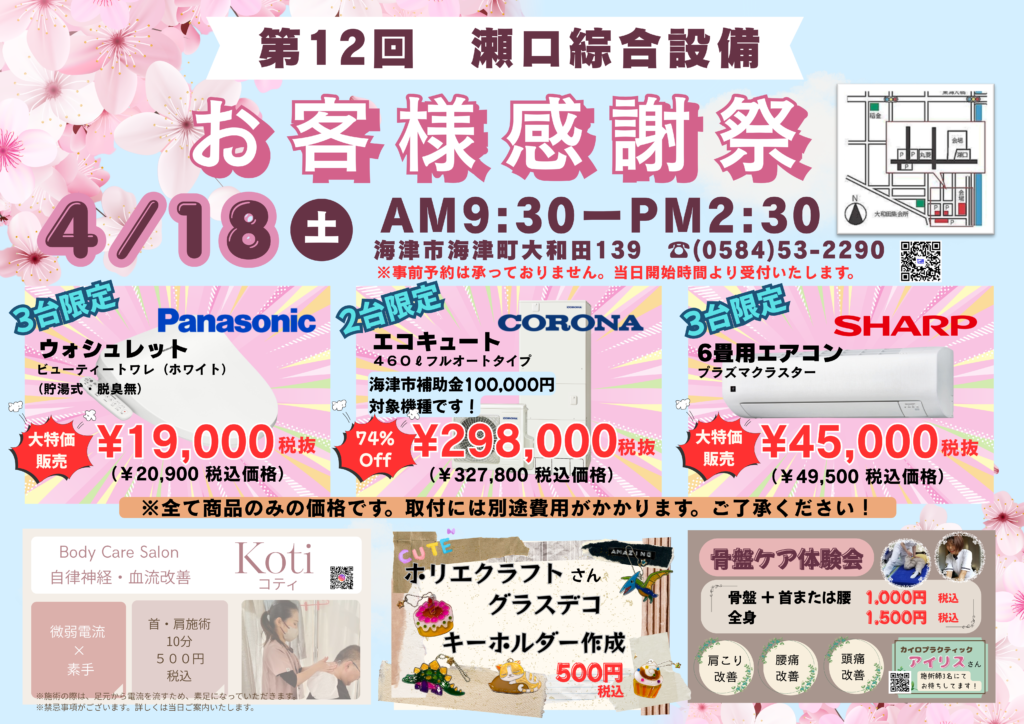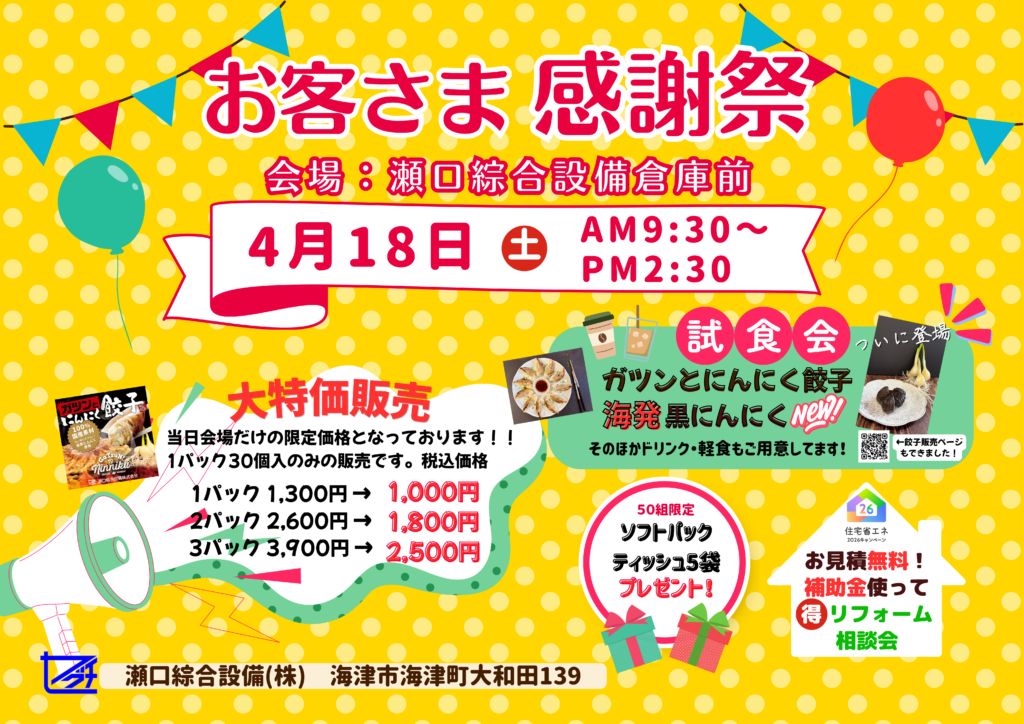 日頃よりご愛顧いただき、誠にありがとうございます。このたび 瀬口綜合設備㈱ では、感謝の気持ちを込めて「第12回 お客様感謝祭」 を開催いたします。